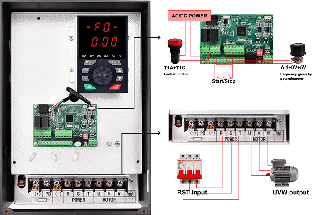 | Segnale di impostazione della frequenza | Pannello operativo integrato | Interruttore a membrana (pulsante), manopola della velocità (potenziometro) |