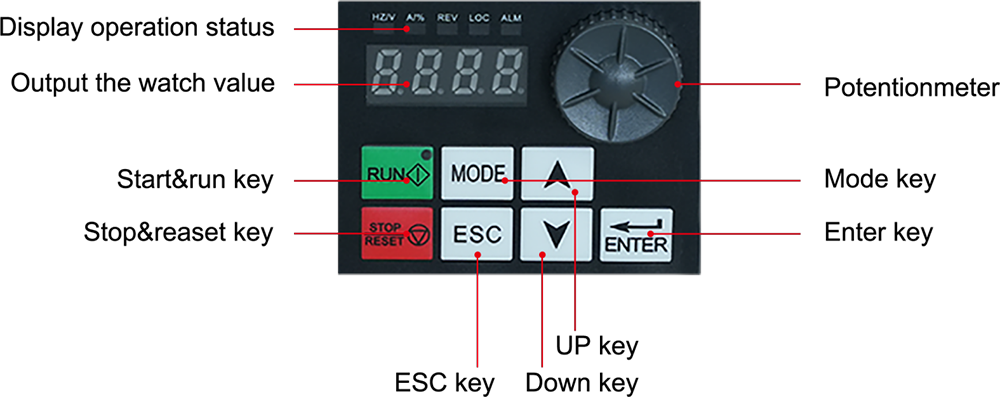 | Segnale di impostazione della frequenza | Pannello operativo integrato | Interruttore a membrana (pulsante), manopola della velocità (potenziometro) |