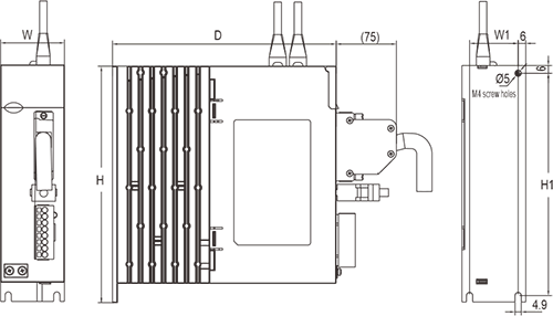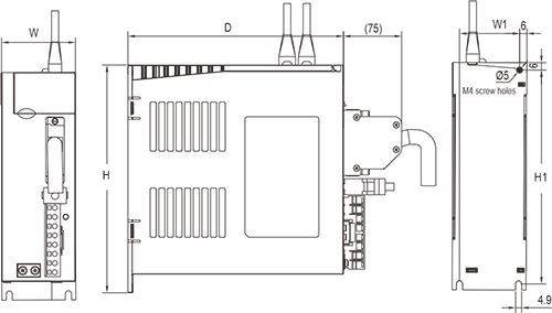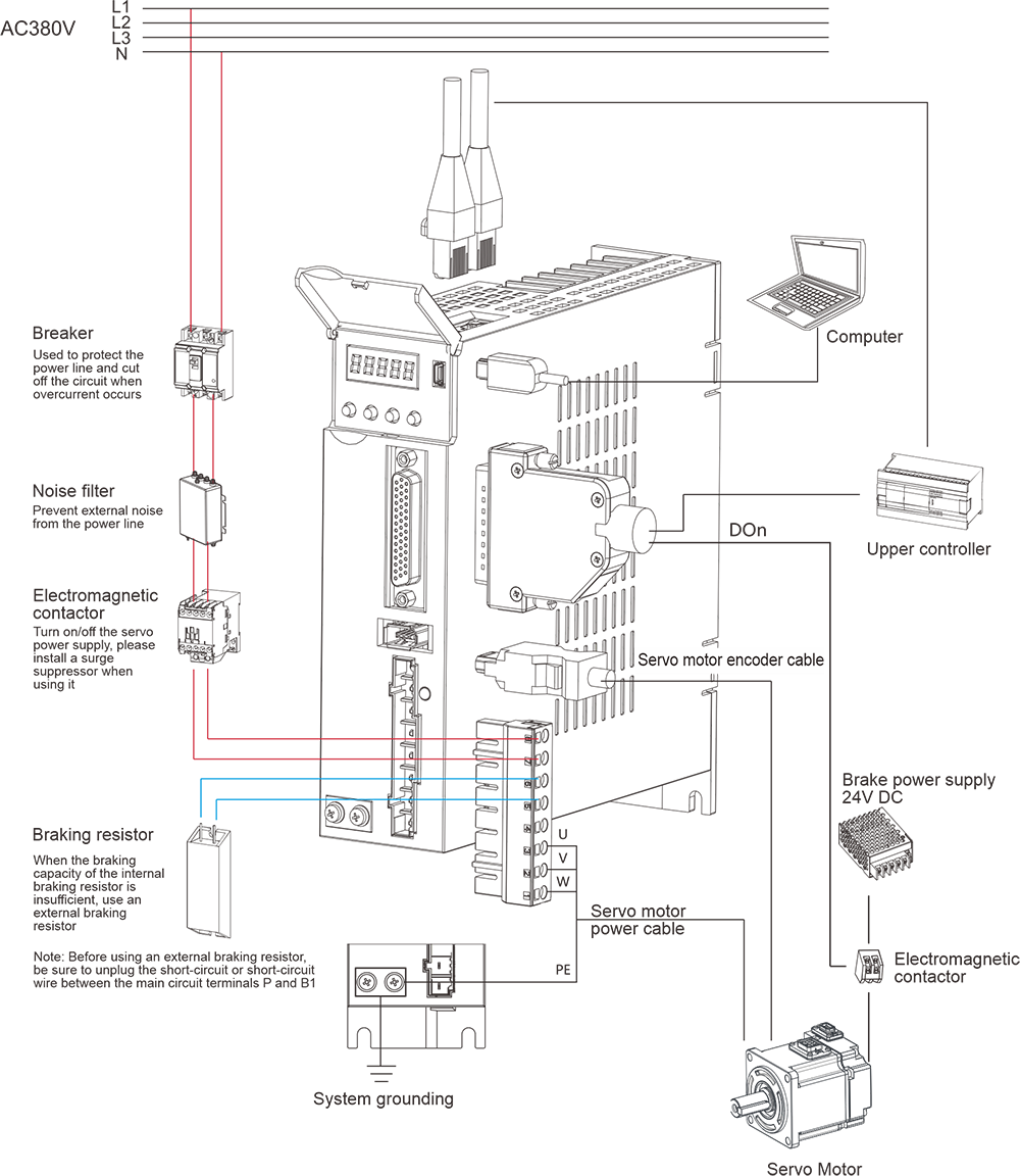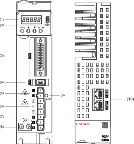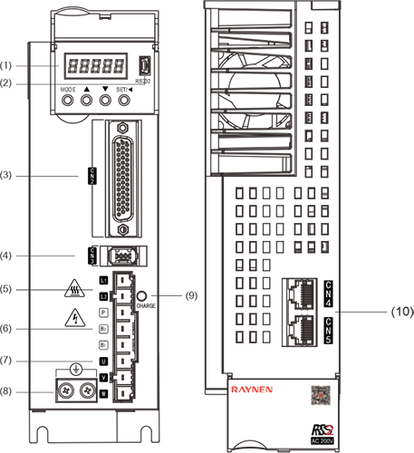 | Descrizione: ① -: Display digitale a sette segmenti ②mini USB: interfaccia RS232, collegata al PC ③CN2: connettore del segnale di ingresso/uscita, collegato al controller programmabile (PLC) o all'I/O di controllo ④CN3: interfaccia encoder, collegata all'encoder sul servomotore ⑤L1, L2: Alimentazione del circuito principale, collegata all'alimentazione monofase (alimentazione 200~240 V CA, 50/60 Hz) ⑥Freno: utilizzare un resistore freno esterno ⑦U, V, W: Uscita del servoazionamento, collegata al connettore di alimentazione del motore (U, V, W) ⑧Vite di terra: collegare alla terra dell'alimentazione e alla terra del motore ⑨CARICA: spia di alimentazione ⑩CN4/CN5: porta di comunicazione 485 | |||