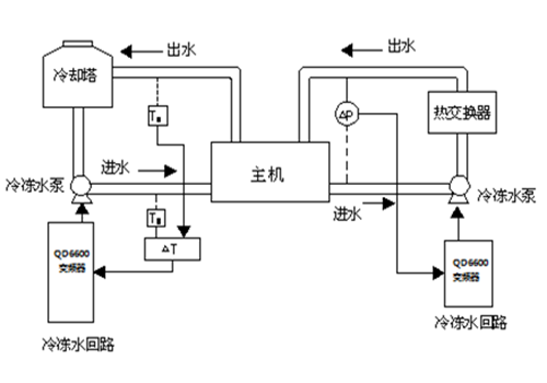 | 04 introduzione al sistema: In questo sistema, due pompe dell'acqua refrigerata da 110KW sono azionate da due inverter D71 da 110KW e sono presenti anche diversi inverter D71 che azionano i ventilatori (compresi i ventilatori interni e i ventilatori delle torri di raffreddamento). Nel sistema di circolazione dell'acqua refrigerata, il segnale 1 (segnale di temperatura o segnale di pressione) del circuito di ingresso dell'acqua e il segnale 2 (segnale di temperatura o segnale di pressione) del circuito di uscita dell'acqua vengono inviati al modulo analogico per ottenere il segnale di feedback analogico dell'inverter. Attraverso la funzione PID integrata dell'inverter, viene realizzato il controllo automatico a circuito chiuso. | | ||||||||||||||||||